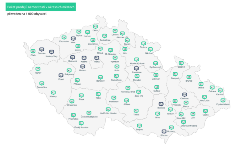 Na druhé straně nejméně prodejů proběhlo v Semilech, Prachaticích a Domažlicích.